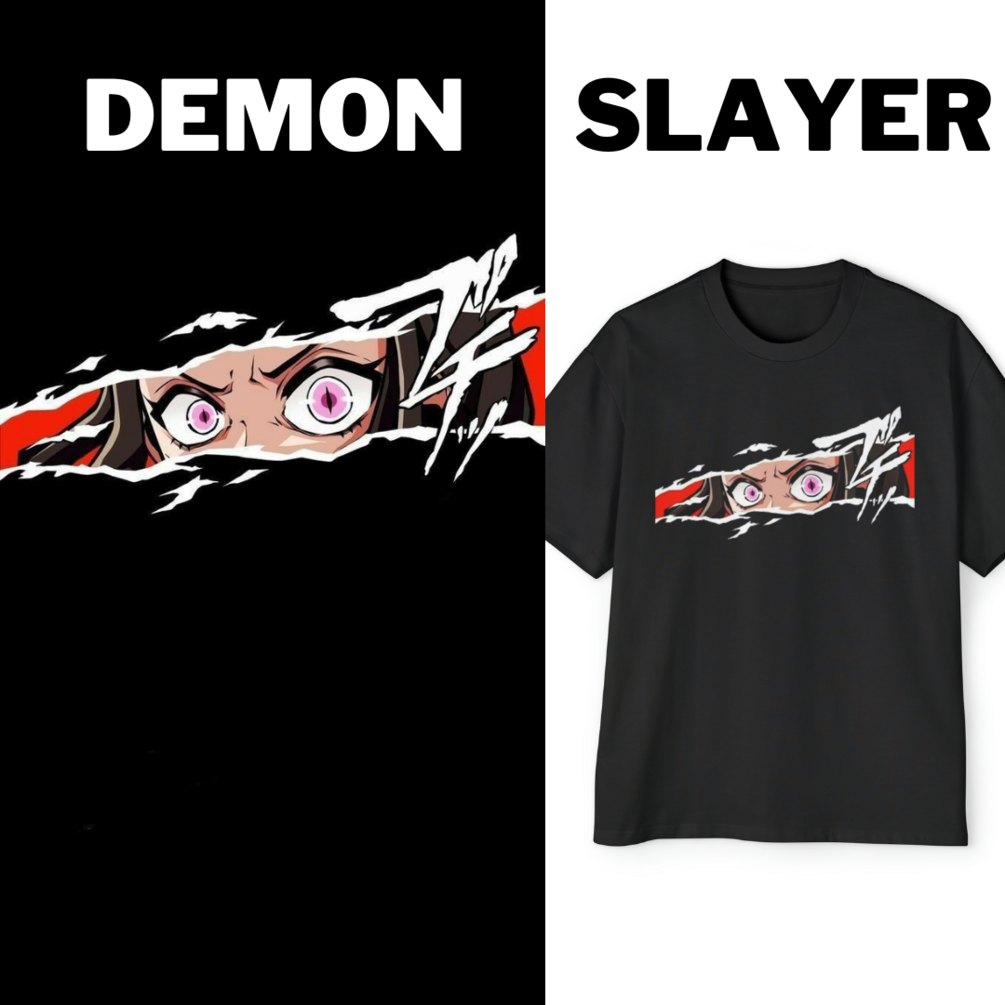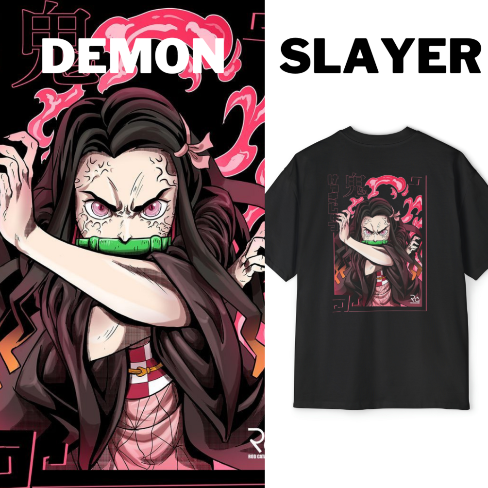 The "Demon Slayer Nezuko T-Shirt" is a digitally designed shirt featuring Nezuko Kamado, a character from the popular anime and manga series "Demon Slayer: Kimetsu no Yaiba." Nezuko is depicted in her iconic demon form, with her distinct pink eyes and bamboo muzzle. The design may also include elements related to her character, such as her demon slaying outfit or background imagery from the series. This t-shirt is likely to appeal to fans of "Demon Slayer" who admire Nezuko's character and want to showcase their love for the series.